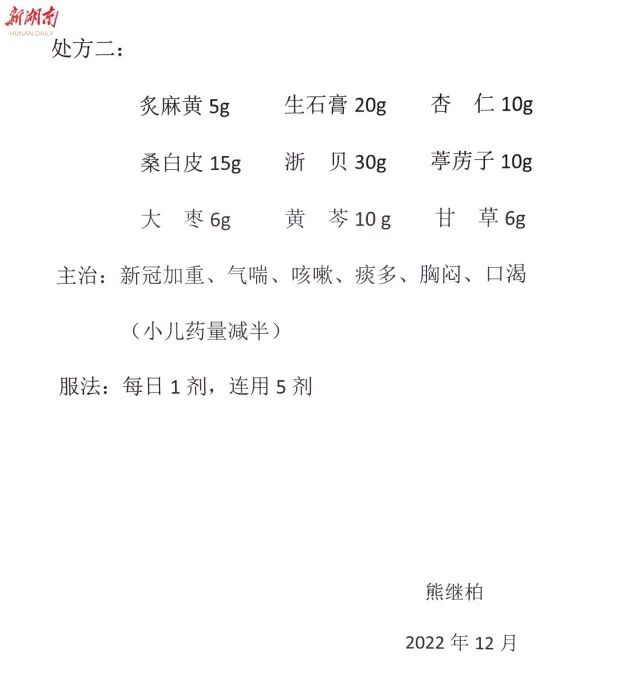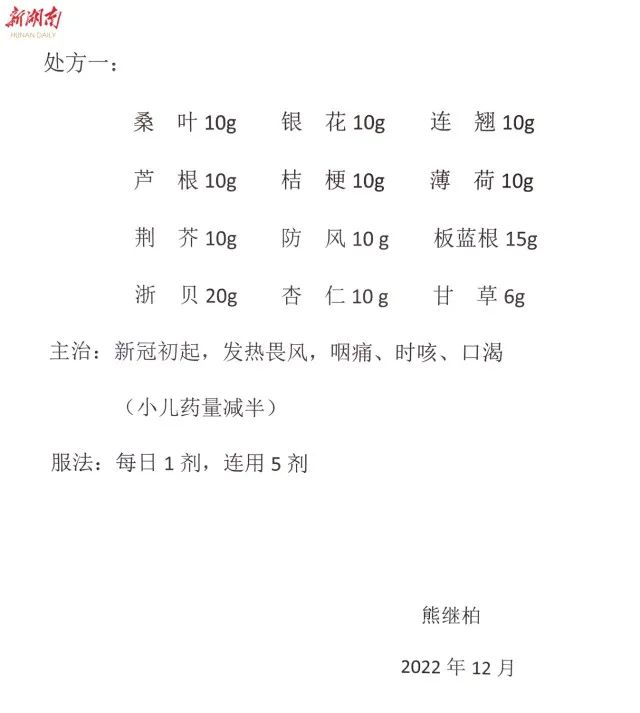 國醫(yī)大師、中國中醫(yī)科學(xué)院學(xué)部委員、湖南省中醫(yī)高級專家組顧問熊繼柏也為大家提供了兩副處方,方便新冠病毒感染者在發(fā)病初期和加重時(shí)使用。